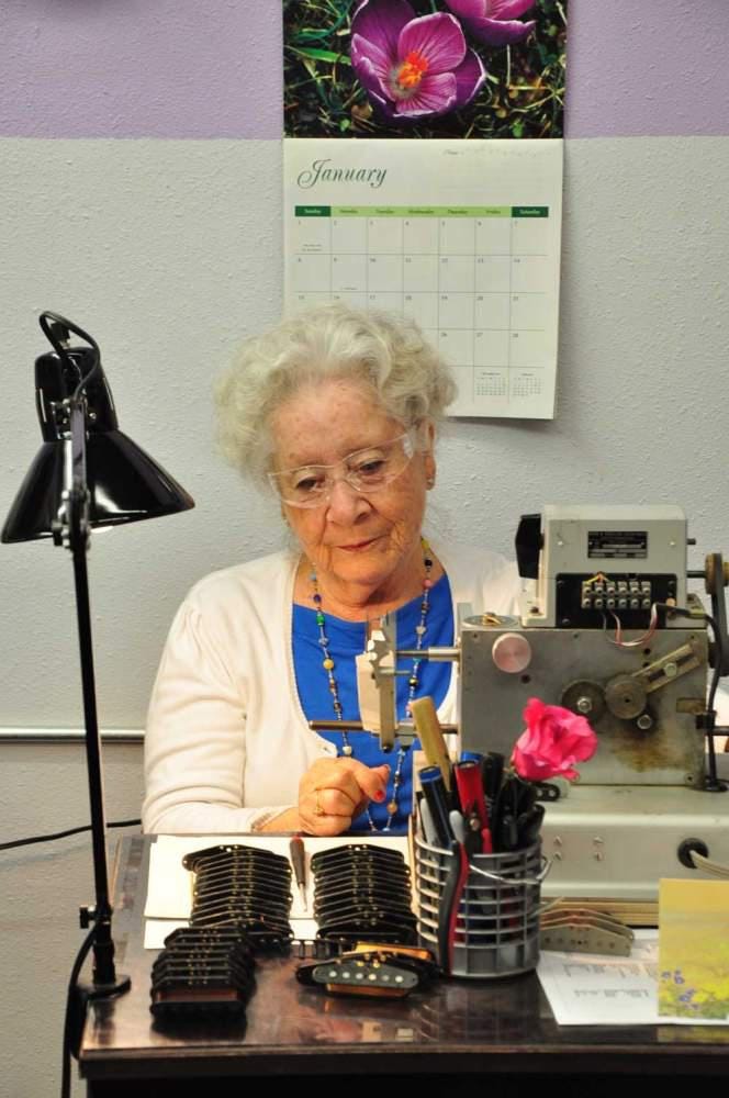 Ybarra started off working on wiring harnesses, but transferred over to pickups just a couple years later. When she started at Fender, all pickups were handwound, and Fender preferred to specifically hire women for pickup-related work, believing that men’s hands were too “rough” (according to Ybarra) for the precise task of winding pickups. Ybarra was taught to wind by Pilar Lopez, who had been taught by Leo Fender himself. However, around 1965, automatic pickup winders were introduced alongside other efforts to cut costs and improve efficiency. According to Ybarra, they went from roughly four handwound pickups per hour to dozens with the machine. Even with the machines, however, winding pickups was a delicate process. Many of the women employed by Fender found winding to be extremely difficult, with the fragile wire frequently breaking.